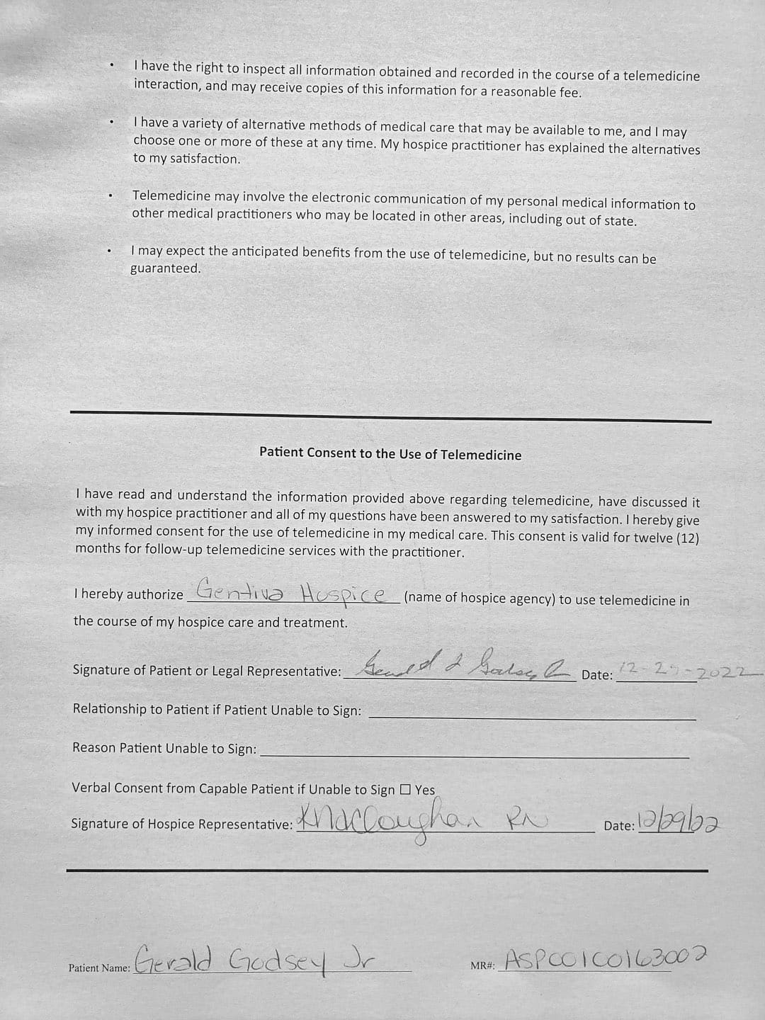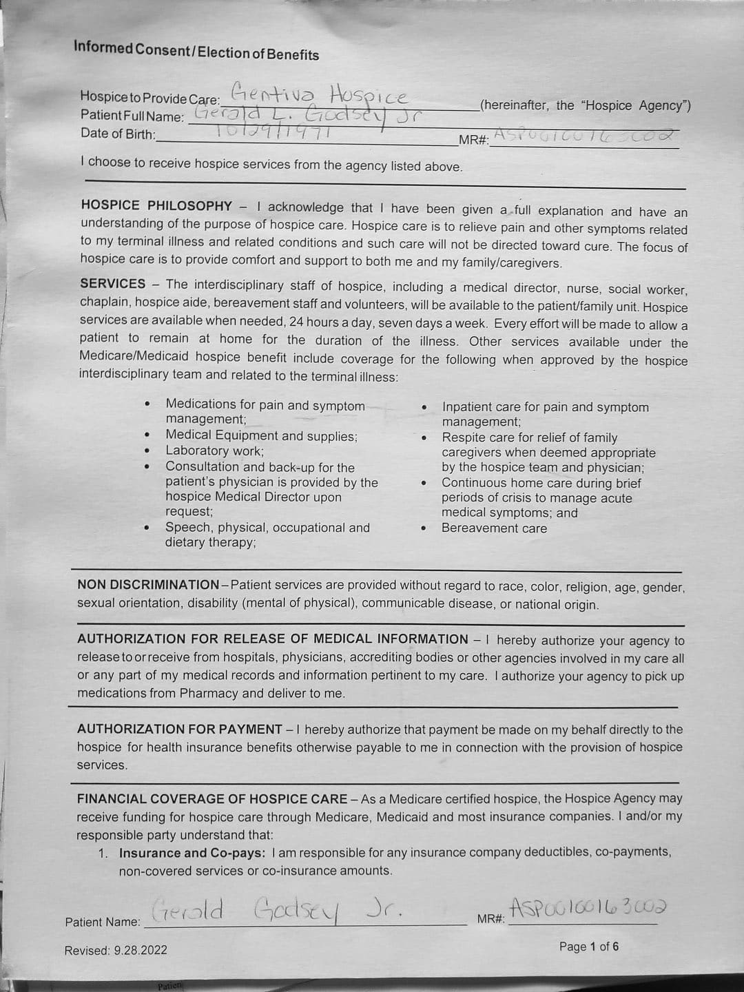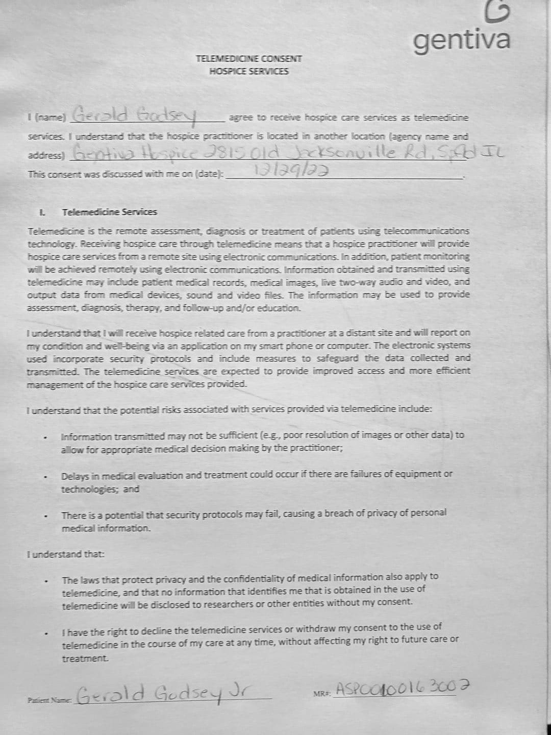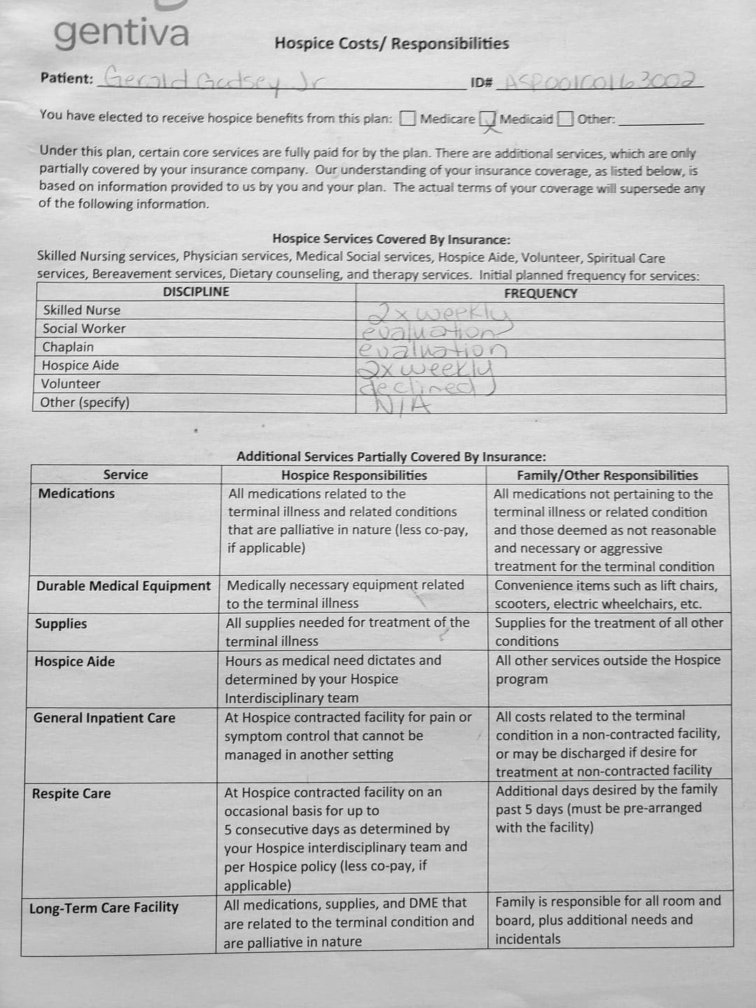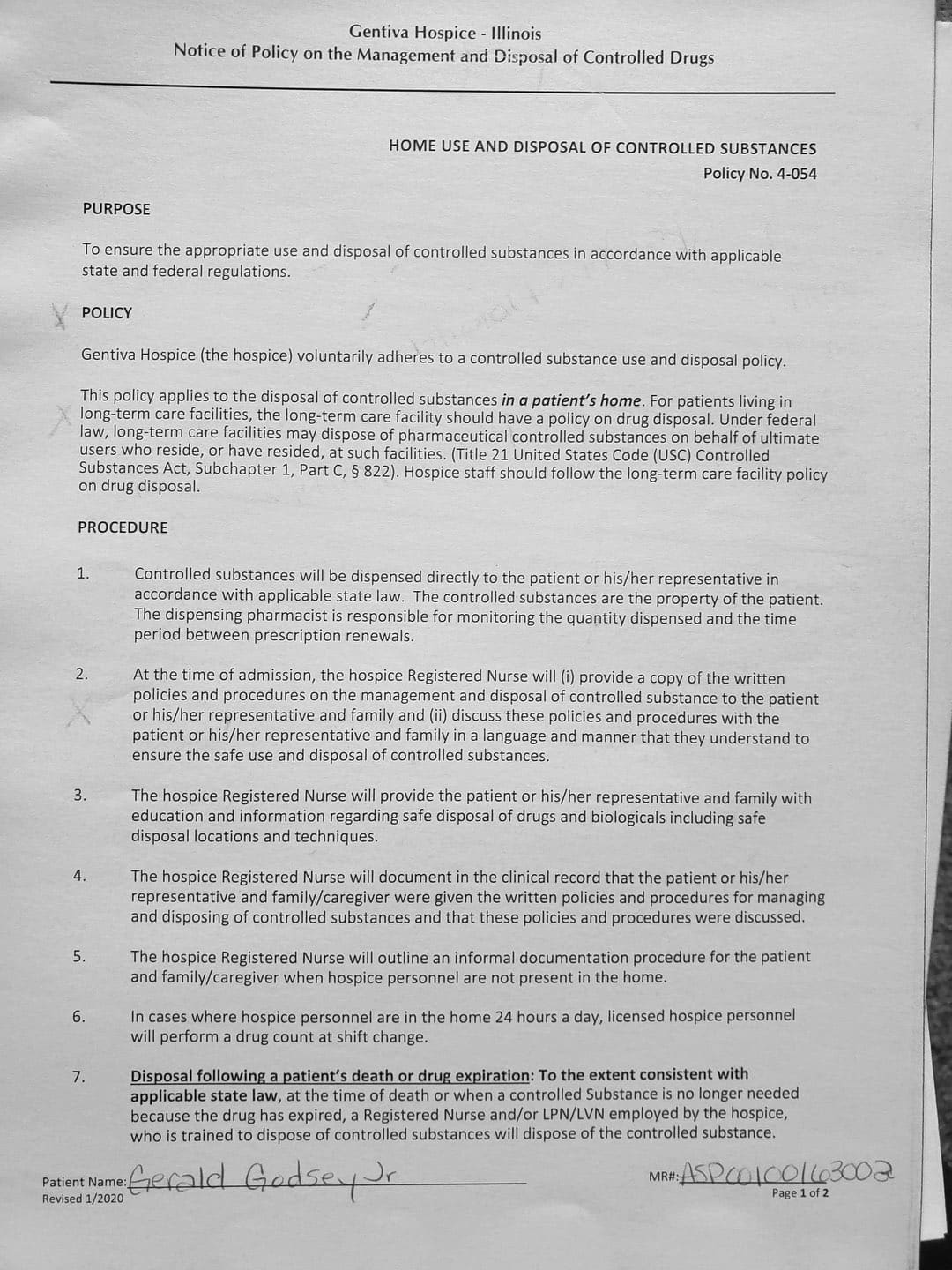 With her violence, destruction, and after hiding out in my father's bedroom for the first month, it came to a point where I thought about hospice. She came to me and told me my Oncologist recommended Gentiva. There was a bed, oxygen tank and other items almost immediately brought over, which I thought was strange. My nephew and my sister was there when the main hospice person with all the documents arrive.