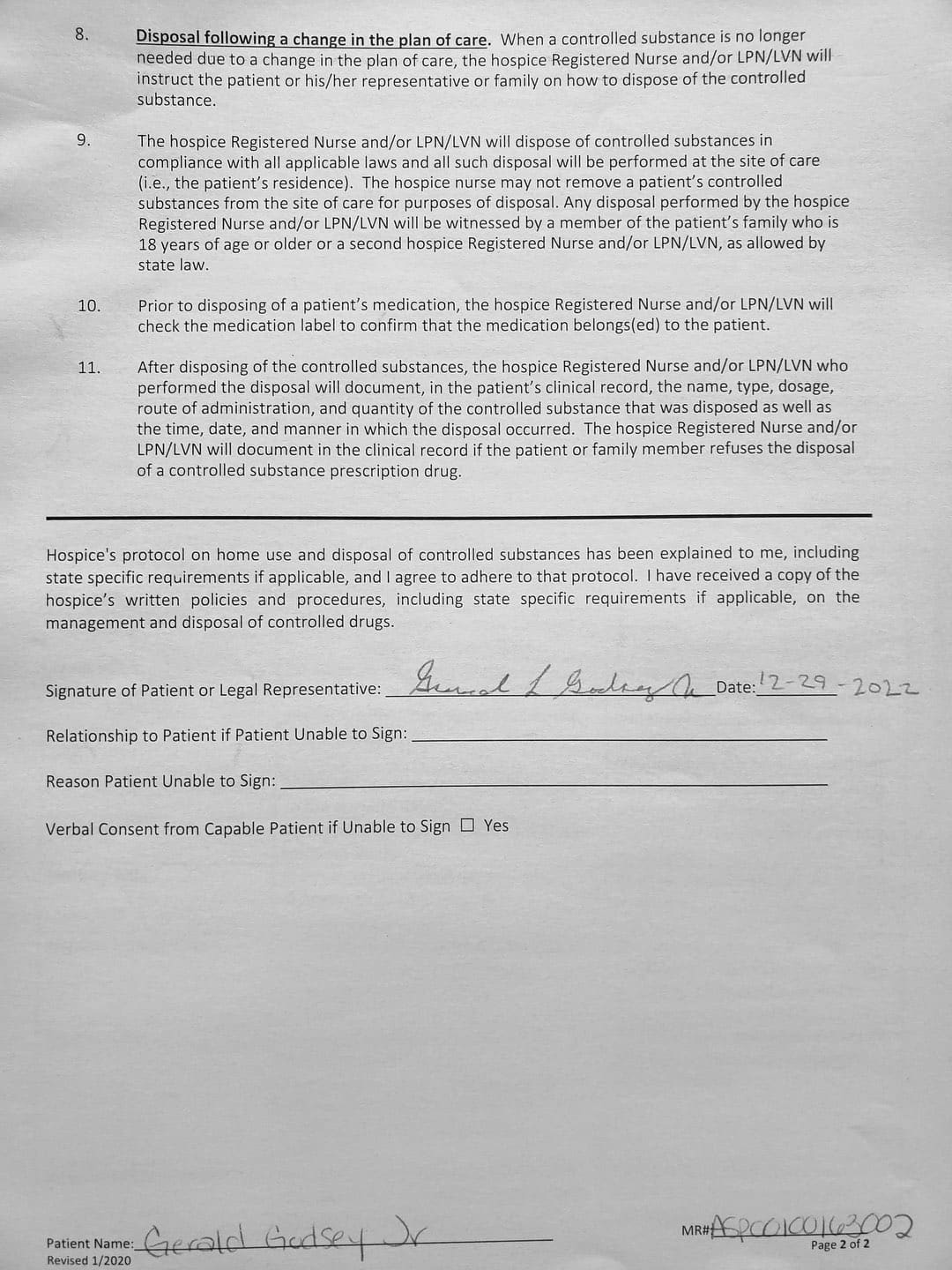 During delivery of things like walking chairs (yeah, two - I was allowed one after actually hearing the delivery but was unaware of the other one, which was stowed away in the spare bedroom along with the oxygen tank. My sister brought me bandages once only after Hospice gave me a card for medical supplies. I never saw that card again and I never got supplies again.